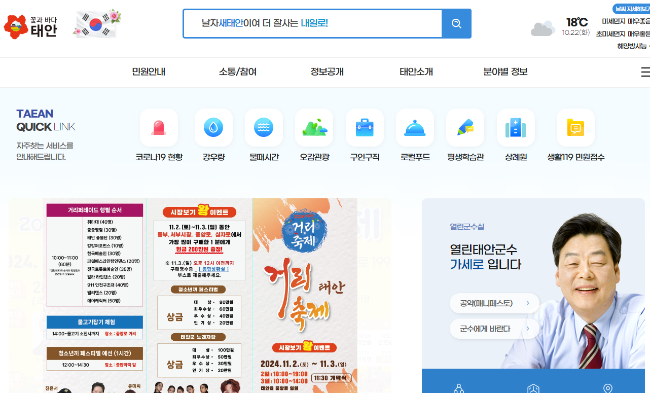 - 군정 소식 및 공지사항: 태안군에서 진행하는 주요 행사 및 공지사항을 확인할 수 있습니다.